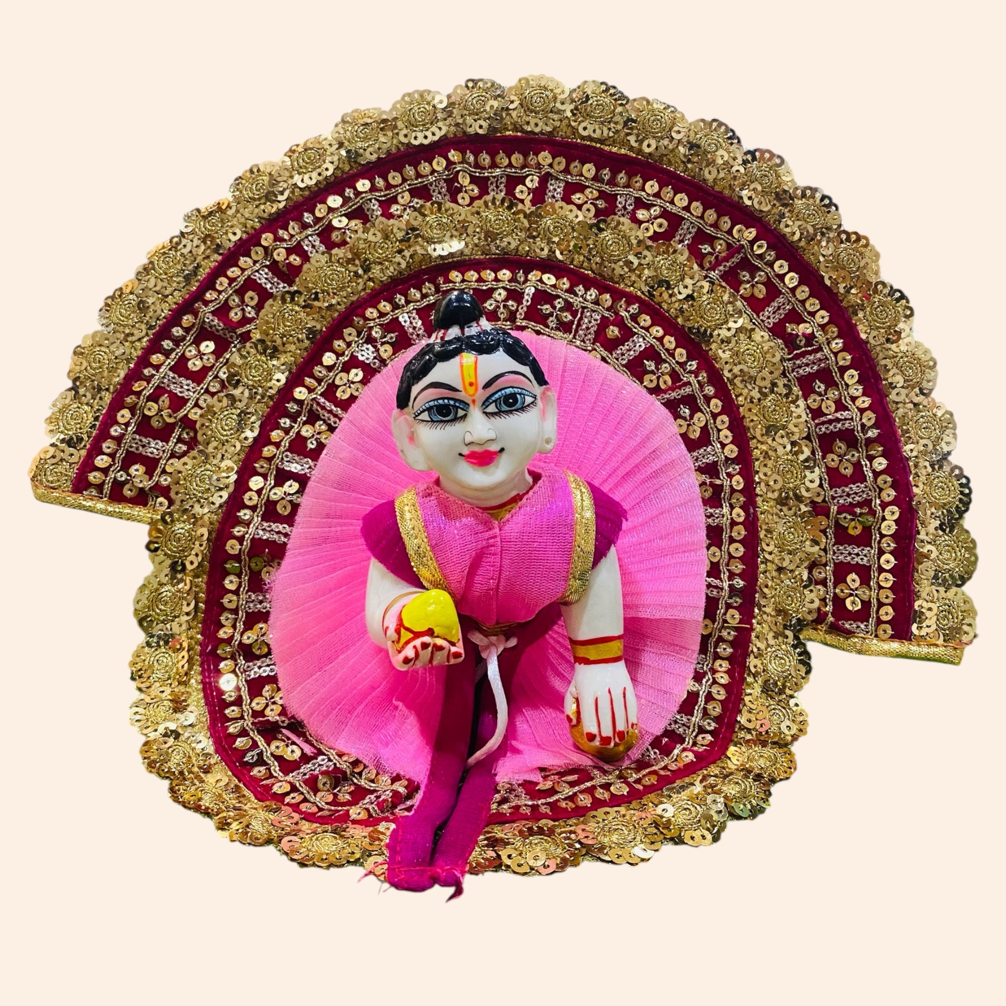 Adorn your Laddu Gopal Ji in this stunning Pink Heavy Designer Dress, featuring detailed golden lacework, an elegant border, and a beautifully coordinated pagdi. Handcrafted with premium fabric and intricate design, this poshak is perfect for festive occasions, daily darshan, or special rituals. A perfect blend of devotion and royalty for your divine Laddu Gopal.