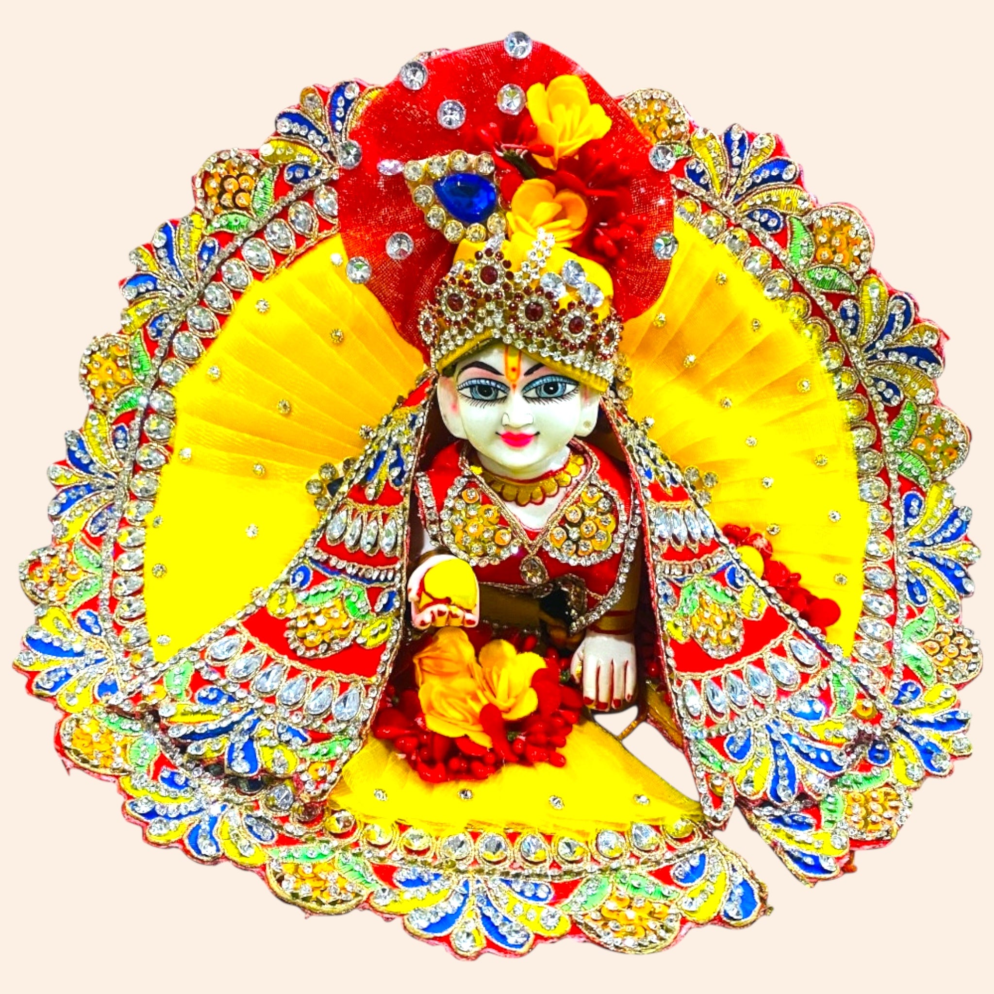 Skilled artisans from Vrindavan have carefully stitched this outfit with devotion in every thread. Its bright yellow hue symbolizes purity, divinity, and energy — perfect for bringing positivity into your mandir or gifting to a devotee.