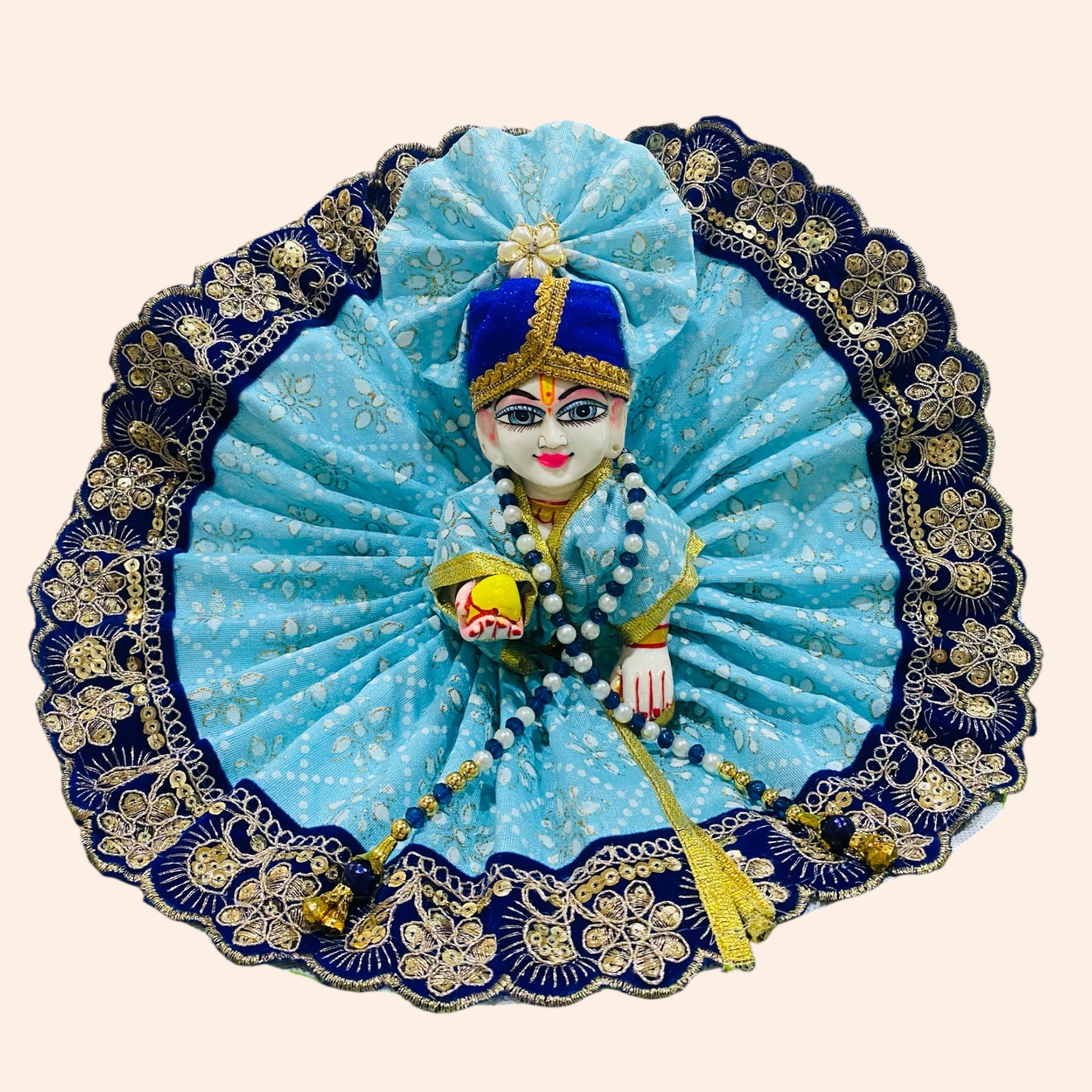 Give your Laddu Gopal Ji a graceful and refreshing look with this Sky Blue Cotton Dress, featuring elegant white flower prints, a bold blue border, intricate golden thread detailing, and a matching pagdi. Crafted from soft cotton fabric, this outfit is perfect for pooja, Janmashtami, and everyday darshan.