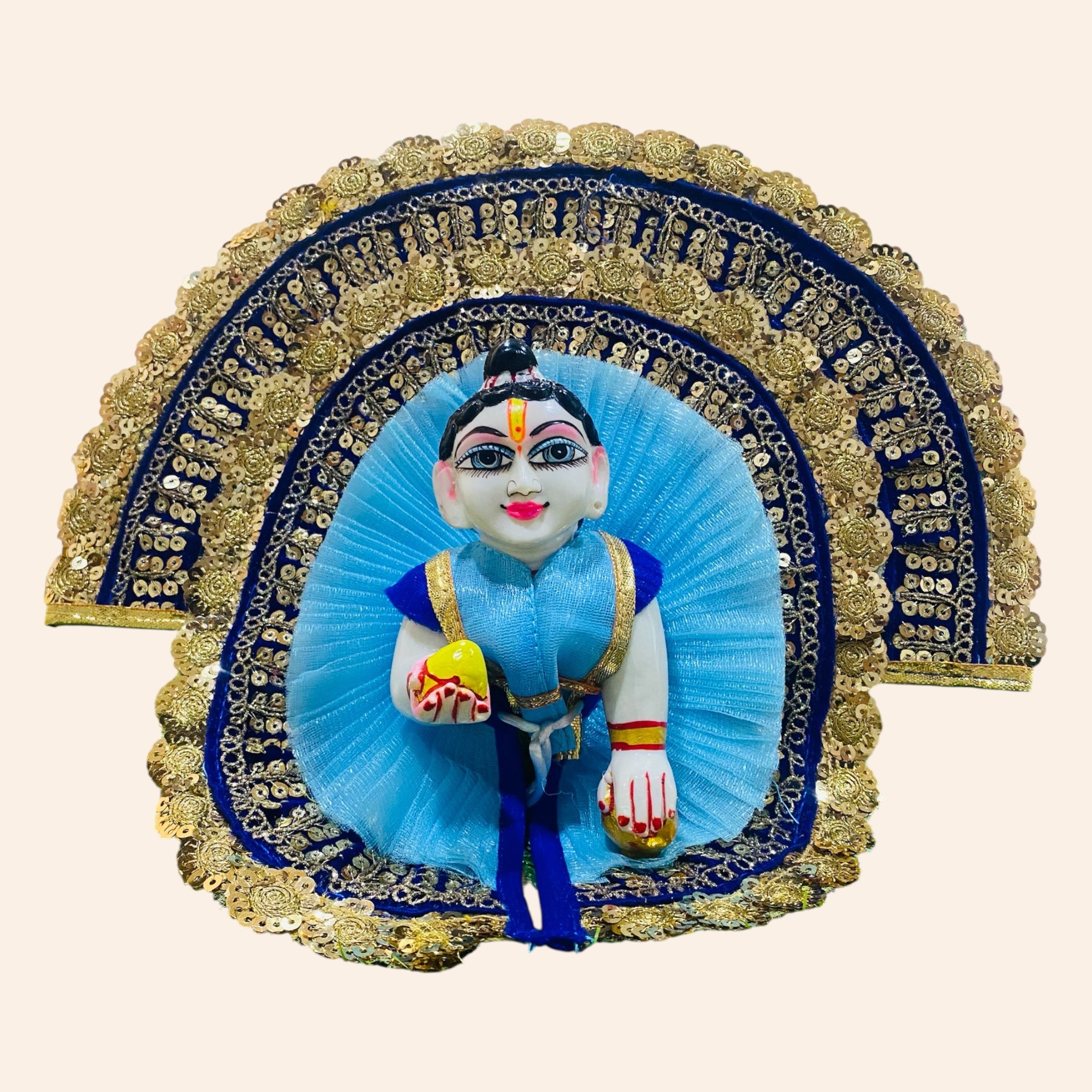 Dress your beloved Laddu Gopal Ji in elegance with this Sky Blue Heavy Designer Poshak, featuring intricate golden lacework and a beautifully crafted matching pagdi. The fine fabric and detailed border design make it perfect for festive occasions, daily darshan, or special pooja rituals. A must-have for every Krishna devotee who values beauty and tradition.