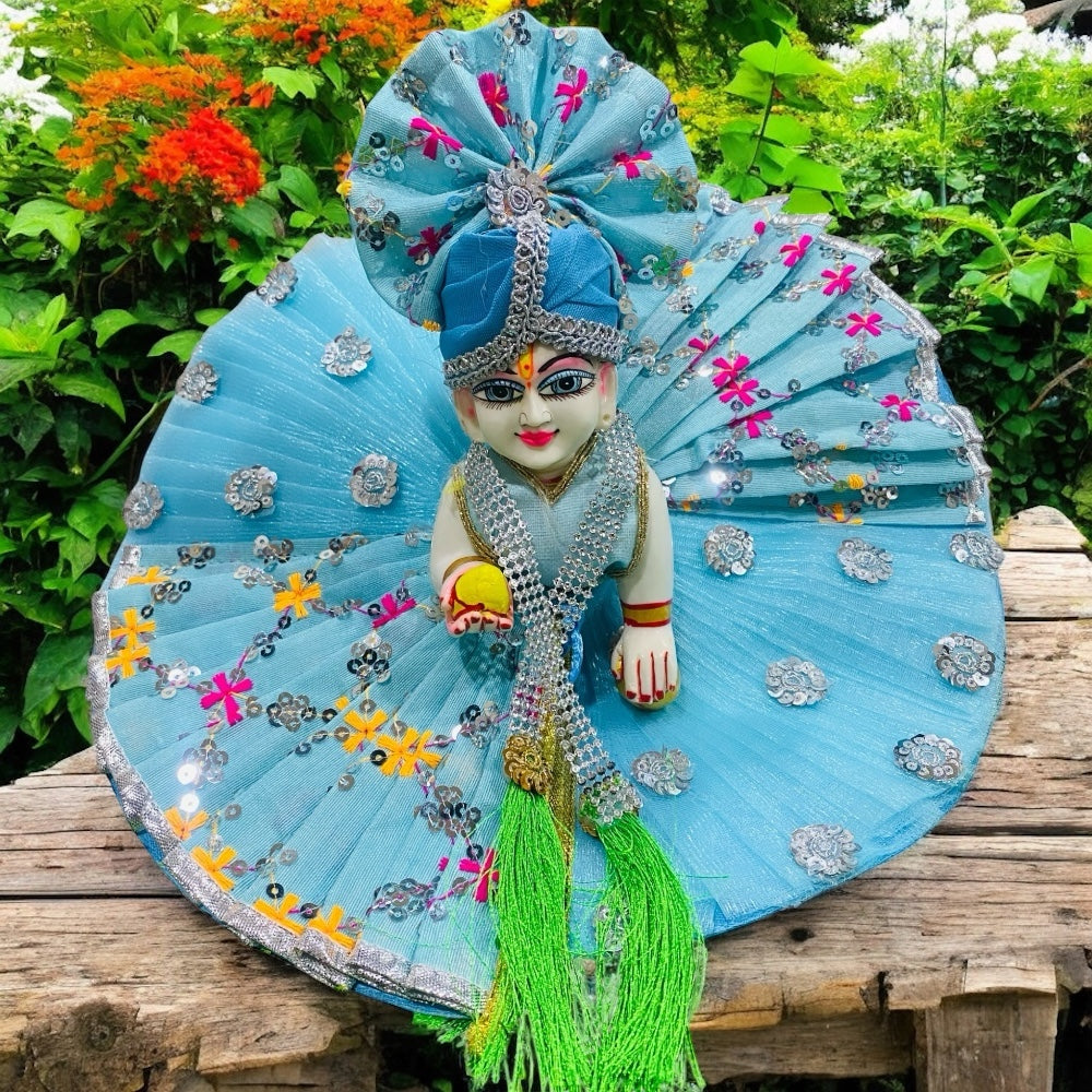 Elevate the grace of your Laddu Gopal Ji with this beautifully handcrafted Sky Blue Dress Set, delicately designed with intricate thread work and complemented by a matching turban (pagdi). Symbolizing peace, devotion, and spiritual calmness, the soothing sky blue shade makes this outfit perfect for daily darshan or festive occasions.