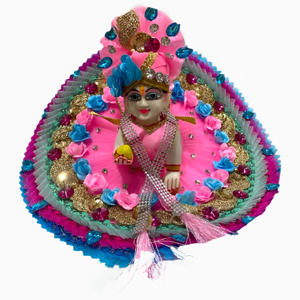 Adorn your beloved Laddu Gopal Ji with this stunning Sky Blue and Pink Dress Set, thoughtfully handcrafted in the sacred city of Vrindavan. Designed to reflect both elegance and divinity, this dress set includes a beautifully matched pagdi (turban) and patka (waist drape)—making it a complete and graceful outfit for your deity.