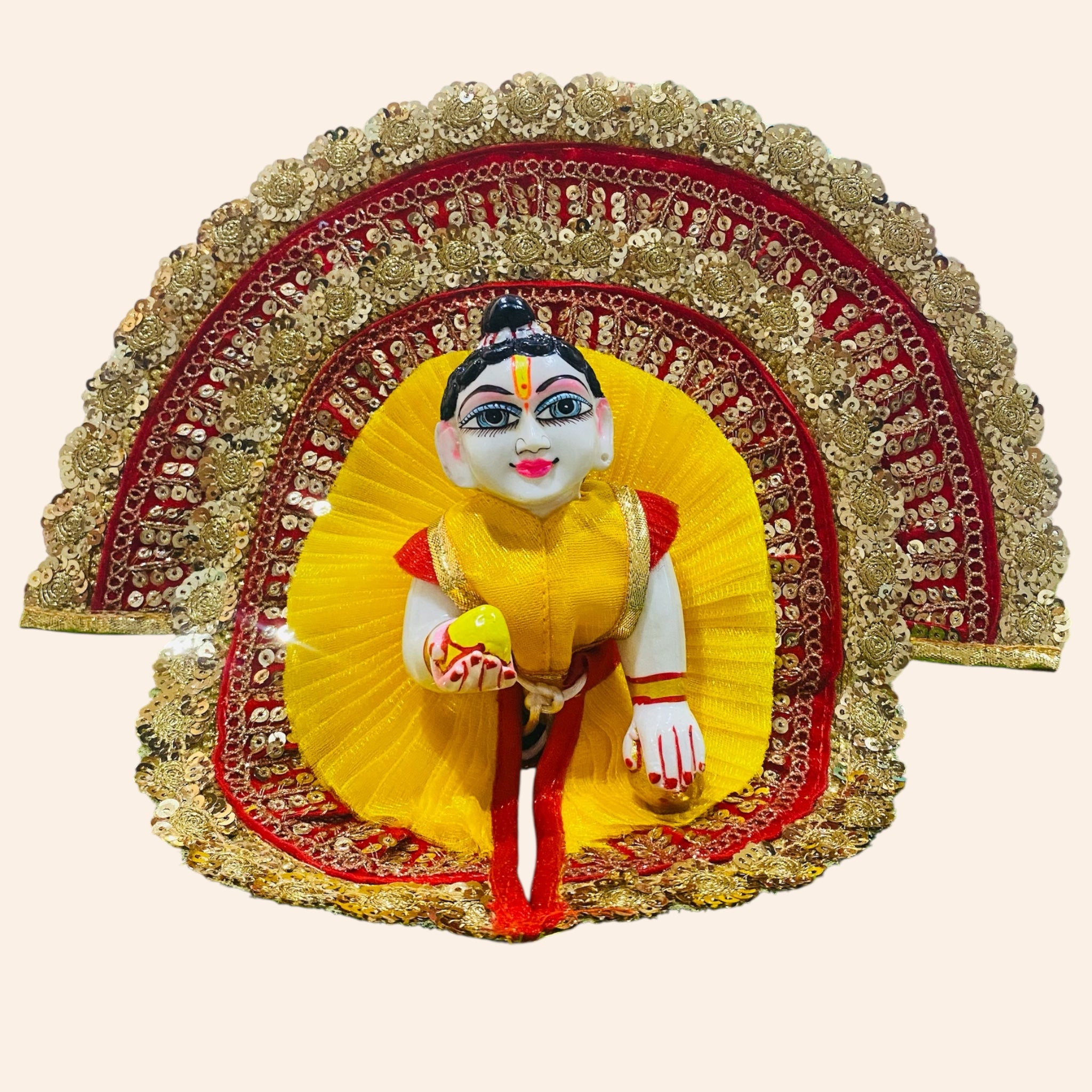 Brighten your Laddu Gopal Ji’s look with this vibrant Yellow and Red Heavy Designer Dress, featuring a matching pagdi, elegant golden lace border, and intricate detailing. This poshak is perfect for festive occasions, Janmashtami, or daily darshan. Handcrafted in Vrindavan, it reflects both tradition and style.